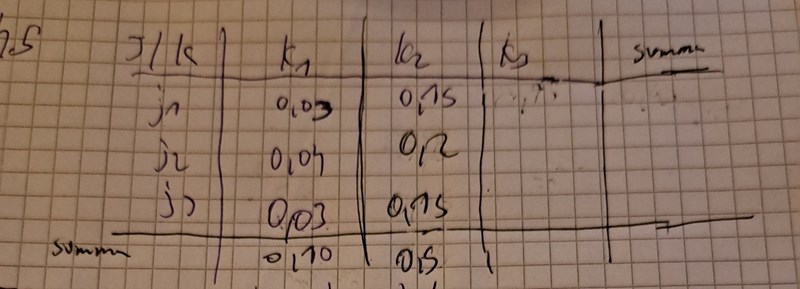 Jag tror inte jag förstår vad som händer och vad jag ska räkna ut. Väldigt förvirrad tyvärr. Vi ska ta reda på det P(j2,k2,),P(j2,k3) , P(j3,k2) och P(j3,k3). Men hur man gör och tänker vet jag inte eftersom du sa att jag ska räkna ihop första kolumnen bara