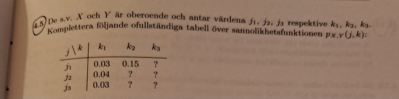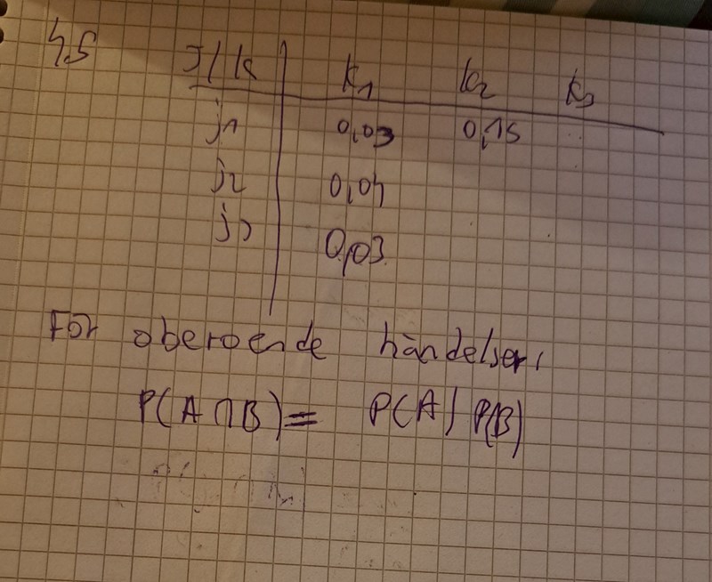 Okej så vi har P(j1,k1)=P(j1)*P(k1). Vi har P(j1,k1) och P(k1) och söker P(j1)