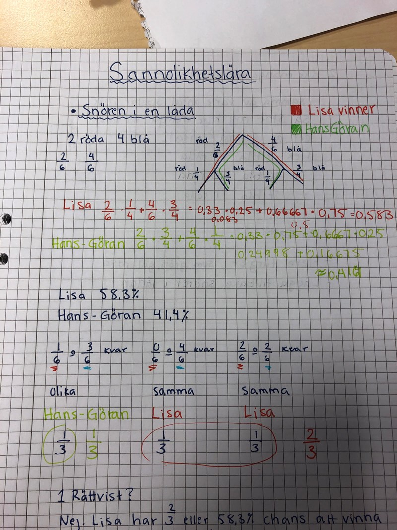 Lisa och Hans-Göran spelar ett spel. De lägger två röda och fyra blå snören i en låda. Båda drar ett varsitt snöre utan stt titta eller lägga tillbaka dem. Lisa vinner om snörena har samma färg och Hans-Göran om de har olika färg.