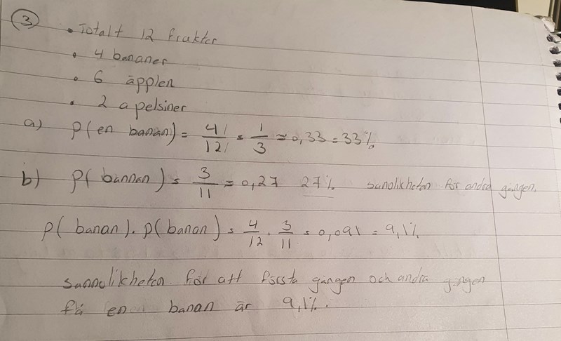Jag har löst uppgiften men är lite osäker på svaret b deluppgiften. Har jag räknat rätt? Ska man bara säga p (banan)= 3÷11 eller ska man multiplicera 4÷12 med 3÷12 ??