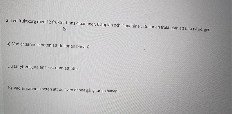 Är 3÷12 att sannolikheten för att få en banan även andra gången och (3÷11)×(4÷12) sannolikheten för att få första gången och andra gången en banan?