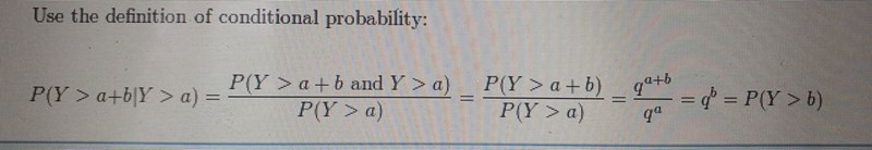 Svårt att säga utifrån bara det där men det ser ut att något antagande gjorts om att Y är geometriskt fördelad. Då är identiteten P(Y>a)=q^(a) en direkt följd av det fördelningsantagandet.