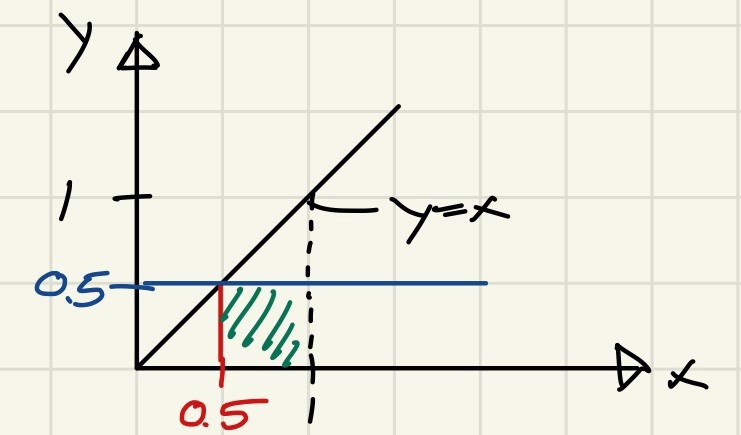 Jag tänker att det borde vara typ såhär, att man ska integrera över det gröna området. Jag ser nu att den nedre gränsen för y inte ska vara x utan 0.