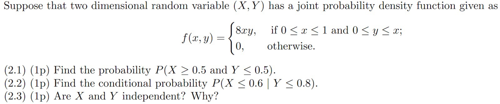 I 2.3 räknar jag ut marginalerna fX(x)=0x8xydy=4x3 och fY(y)=018xydx=4y, de är också fel och ska vara 4x3 och 4y-4y3