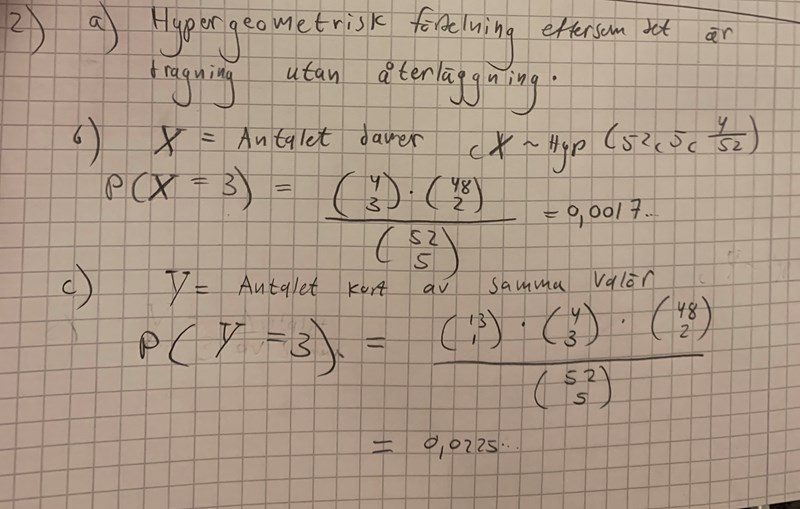 c) Beräkna sannolikheten att 3 av korten är av samma valör
