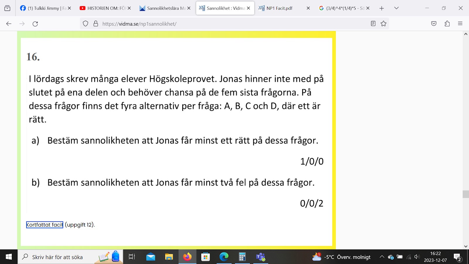 Frågan lyder: Om jag har 5 frågor kvar på ett prov med 4 alternativ på varje fråga ( A, B, C och D, endast ett svar är korrekt per fråga) Vad är sannolikheten att jag får minst 2 fel om jag skulle chansa på dem 5 sister frågorna??
