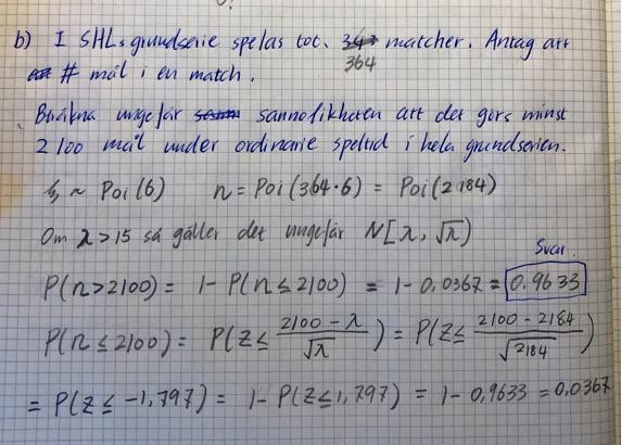 För a)-uppgiften väntevärde 6 i Poissionsfördelning är samma sak som i uppgiftensbeskrivning "i genomsnitt ca 6 mål" eller hur?