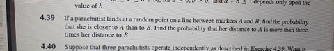 Ifall man ser dåligt vad som står på bilden så kan jag skriva ner frågan här också så att det syns bättre "If a parachutist lands at a random point on a line between markers A and B, find the probability that she is closer to A than to B. Find the probability that her distance to A is more than three times her distance to B"