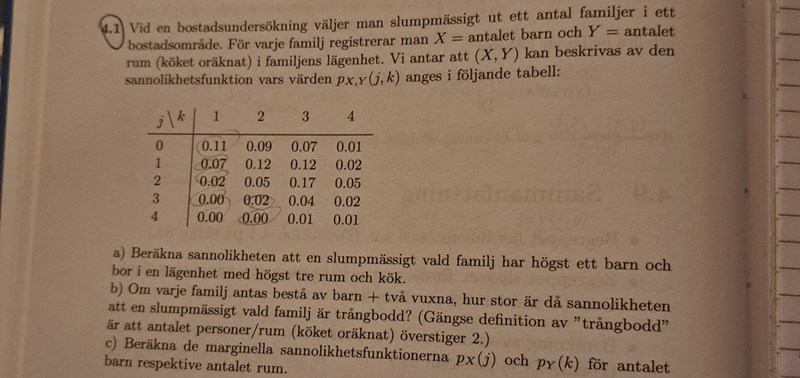 Jag fastnade på a) uppgiften samt b). Hur ska man börja? När de säger högst ett barn och högst tre rum antar jag att de menar P(X>=1)+P(Y>=3)
