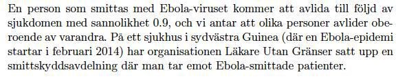 Smaragdalena skrev:Så som jag tolkar frågan undrar de hur stor sannolikheten att exakt 10 av de 19 patienter som tas in de två aktuella veckorna avlider.