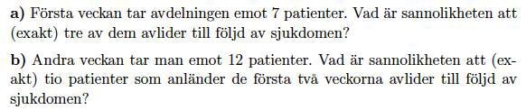 Ingen vettig tentakonstruktör skulle ha skrivit en så luddig fråga, möjligen "Beräkna sannolikheten att exakt 10 personer avlider under de två veckorna, varav 3 avlider under den första veckan". I så fall skall du beräkna sannolikheten att exakt 3 av 7 dör av dem som kom in den första veckan, och multiplicera det med sannolikheten att exakt 7 av 12 dör av dem som kom in den andra veckan.