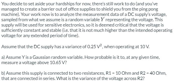 Det framgår i texten att variansen är V[Y]=0.25 V2, jag vet att V[Y]=σ2V[Y]=\sigma^2. Då är standardavikelsen σ=0.5V\sigma=0.5 \text{V}. Det står även att DC körs med 10V, vet inte riktigt vad det har för relevans till uppgiften.