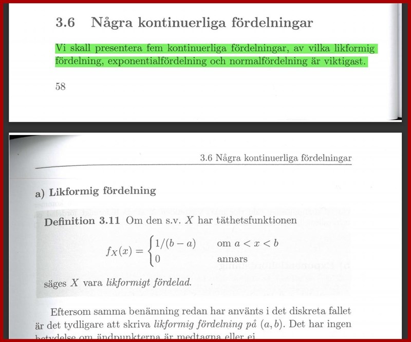 Hej, min kursbok är förvirrande. Ett delkapitel heter "Några kontinuerliga fördelningar", där tas några funktioner upp, bland annat likformig-, exponential-, normal-, Weibull- och fler. Men boken kallar inte de för fördelningar sen, utan kallar dem för täthetsfunktioner:
