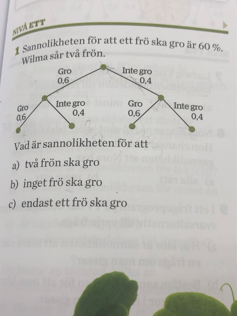 1: Första fröet gror, andra fröet gror inte. Sannolikheten för detta är 24 %.