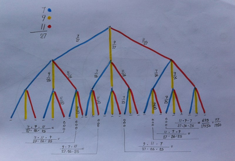 Enligt uppgiften ska svaret vara i bråkform och inte i ett träddiagram :/ Det står att svaret är "P(blå,gul,röd) = 7/27 * 9/26 * 11/25 - 77/1950"