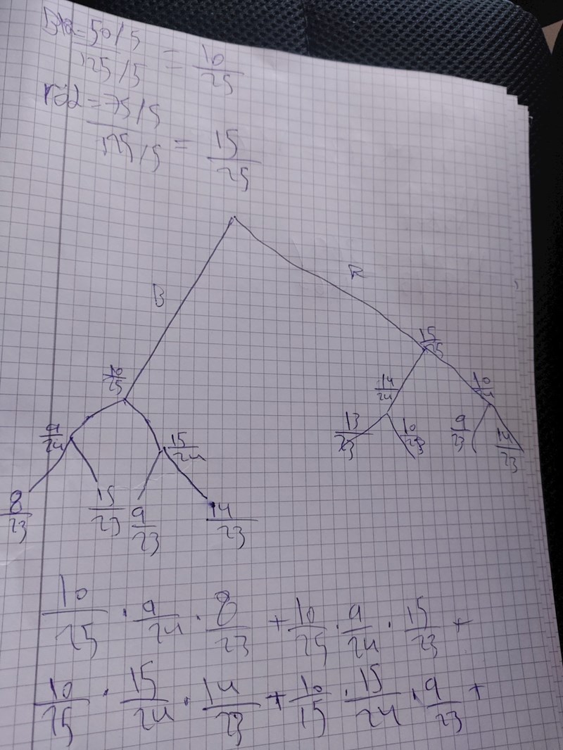 There are 50 blue marbles in a bag and 75 white marbles. Anton must draw three times without relegation. What is the probability that Anton draws at least one blue ball.