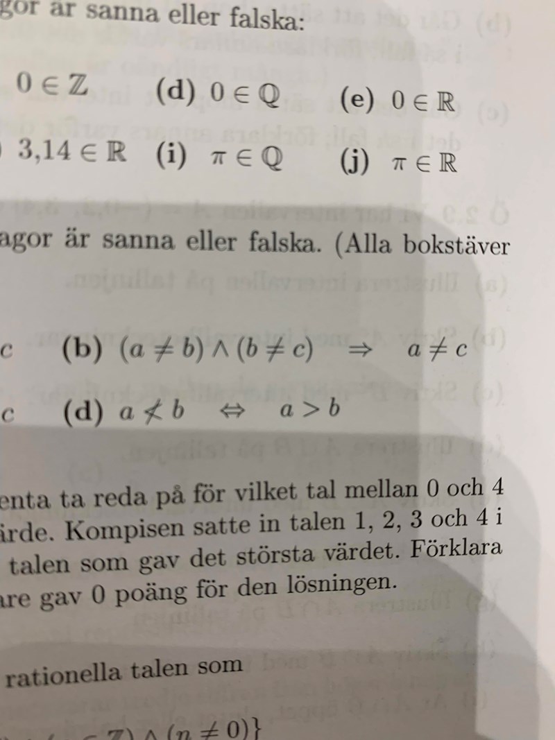 jag förstår inte hur man läser upp (d) att a är större än b men b får inte vara större än a hur ska man tänka på ekvivalens jag vet att alternativet är falskt men kan någon förklara den lite enklre