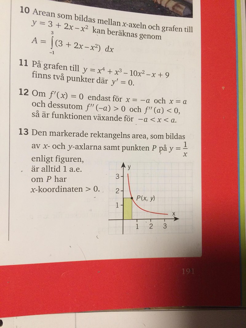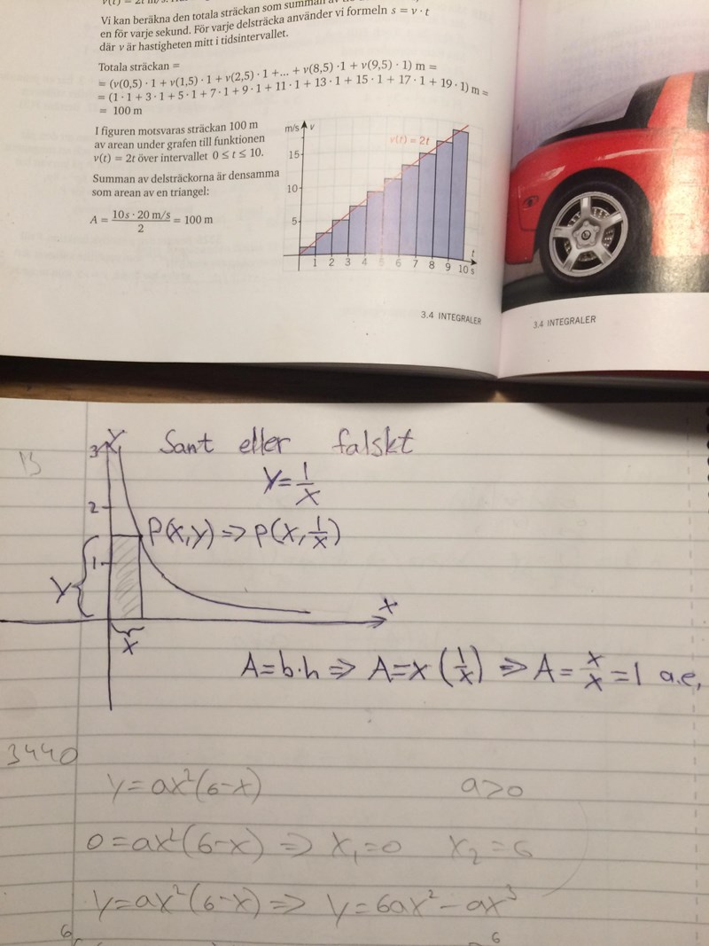 Sådana här uppgifter går ut på att räkna ut om det som står i en uppgift är rätt eller fel. Så jag behöver hjälp med en sådan uppgift. Det är uppgift 13 på bilden. Man ska alltså avgöra om rektangelns area under grafen, som bildas av x- och y-axlarna alltid är 1 a.e. I bilden ovanför uppgiften framgår hur jag har löst denna uppgift och kommit fram till att det är sant. Stämmer min lösning?