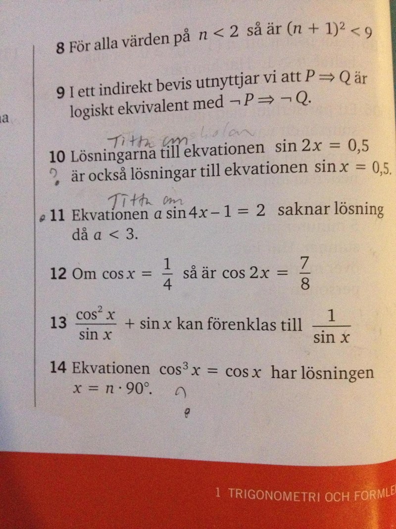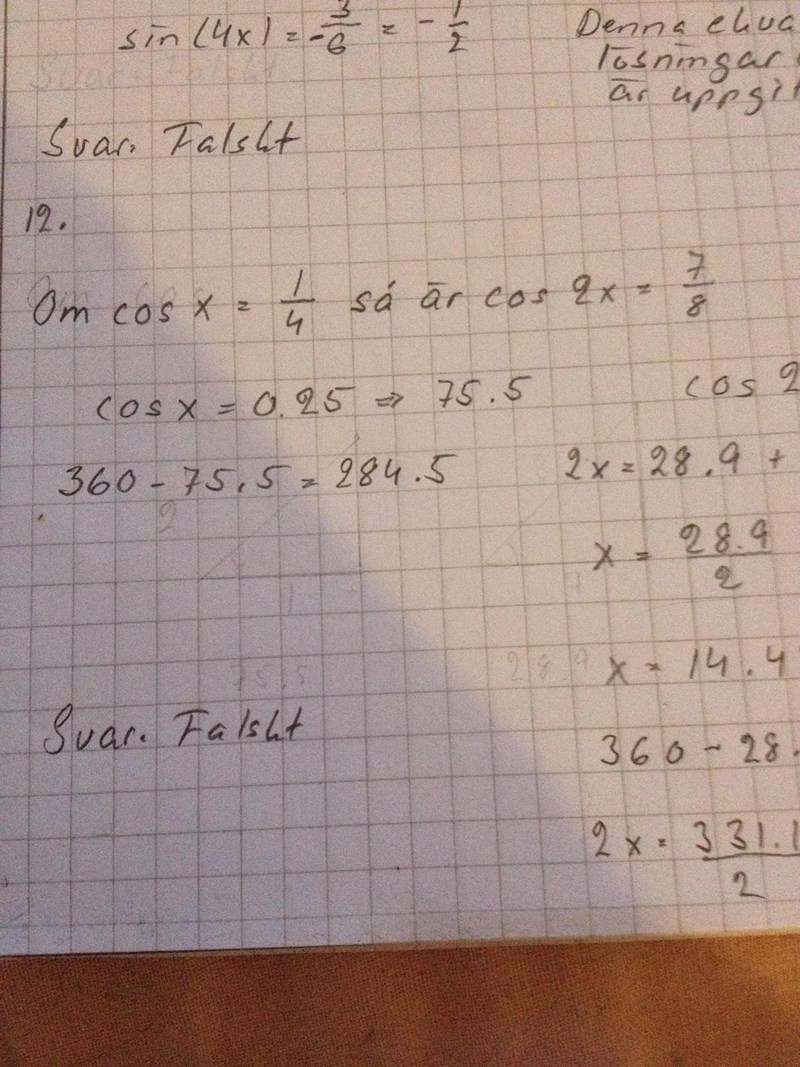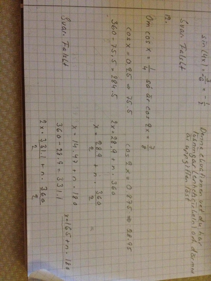 Ja, alltså du kan göra så att du löser ekvationen cos(x) = 0.25 och testar om lösningarna och ger att cos(2x) = 7/8. Men i detta fall så behöver man inte lösa ekvationen, man kan använda direkt att
