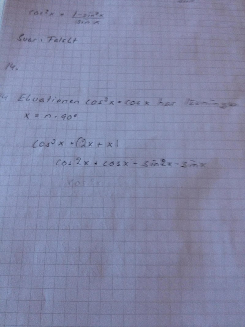 cos3 x = cos xt3 = tt3 - t = 0t(t2-1) = 0 Den sista ekvationen har tre lösningar, t = 0, t = 1 och t = -1. Det innebär att cos x = 0, 1 eller -1. Vilka vinklar ger dessa cos-värden?