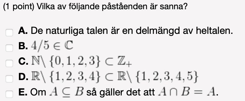 Jag tycker att A och B är sanna och C och D falska. Förstår inte E då jag inte vet vad tecknet mellan det första A och B betyder. Tacksam för hjälp då det inte är rätt svar jag får!