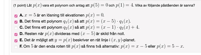 Jag förstår inte vilka som är sanna och falska. Tycker att A, B, D och E absolut är sanna, men det är antingen inte bara de eller så är någon av de falska. Har inget facit utan ser bara vilka som är rätt när jag klickar i de. Som det är iklickat i bilden är inte rätt säger den. Tacksam för svar!