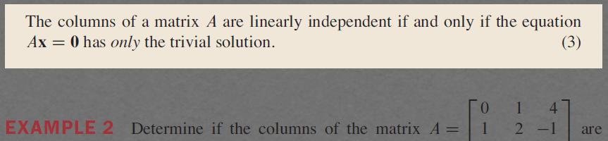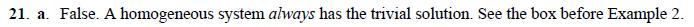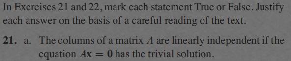 Matrisen A i uppgift 21 har den triviala lösningen, så då borde ju kolumnerna i A vara linjärt oberoende?  Då måste det ju vara sant, vi pratar ju inte om att matrisen A har någon annan lösning än den triviala lösningen.