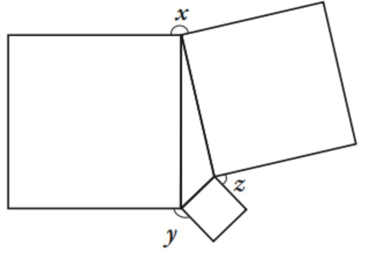 I en triangel är kvadrater ritade utifrån triangelns sidor, se figur. Visa att x+y+z=360°.