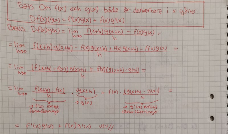 Hej jag håller på att kolla igenom föreläsningar inför tenta som kommer i januari. Men det är ett steg (rad 2 i bevis) i denna bild nedan jag ej förstår. Jag förstår inte var "-f(x)g(x+h) + f(x)g(x+h)" kommer ifrån.