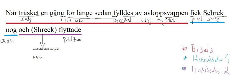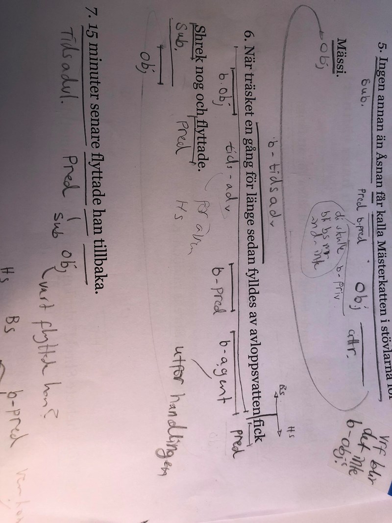 Som ni ser så är det uppdelat i BS (bisats) och HS (huvudsats), det jag undrar är om man kan lägga predikat, subjektiv, tidsadverbial, objektiv på både HS o BS? Om man då stoppar in alla de olika objektiv, subjektiv osv får man bara utgå från de markerade meningarna (dvs endast på bs- området o sen lägga in andra subjektiv o objektiv osv på endast hS- området för att det är en Anna avgränsad del av meningen(där jag med pilar visar var hs o bs går) att det finns tex objektiv eller får man igår från hela texten att där finns subjektic?