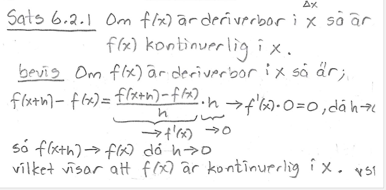 f är kontinuerlig  om   limh0f(x+h) = f(x)  dvs om limh0 ( f(x+h) - f(x) ) = 0.