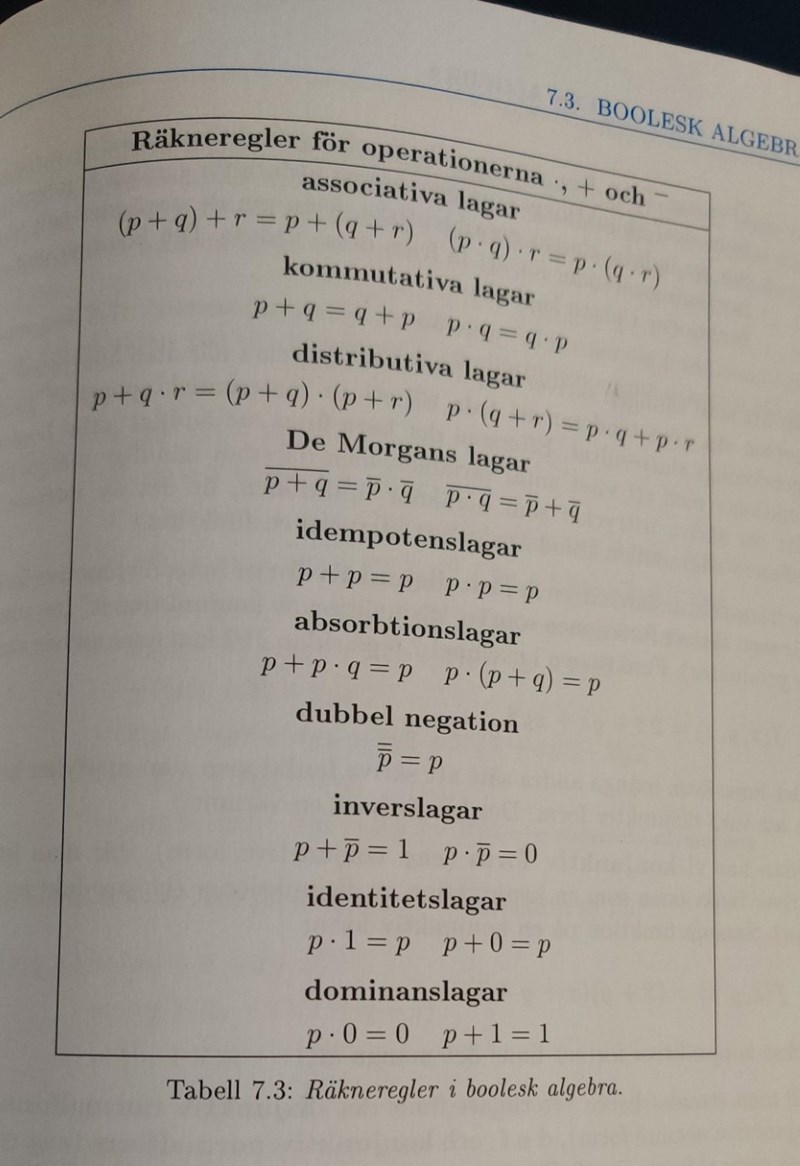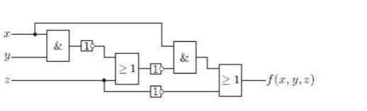 Detta är en logisk krets. Skriv ner funktionen beräknad av denna krets. Hitta värdetabellen och skriv funktionen i både konjunktiv och disjunktiv normalform. Gör dessutom omvandlingen från original till disjunktiv normalform med hjälp av reglerna i tabell 7.3.