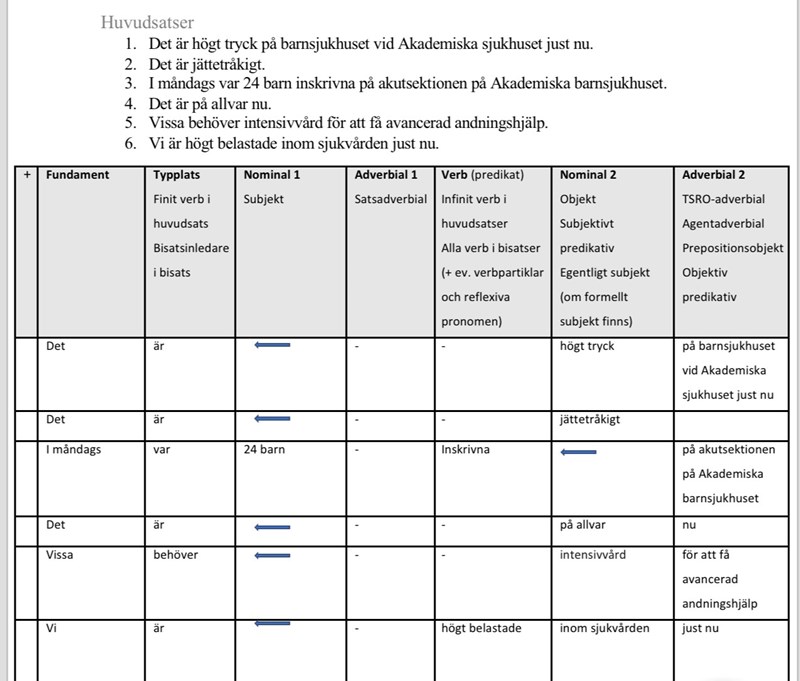 Jag har svårt att skilja på när jag ska se något som en objekt eller som en plats. Inom sjukvården just nu anger tid och plats och bör då var under adverbial 2. Men samtidigt tänker jag att sjukvården borde vara ett objekt?
