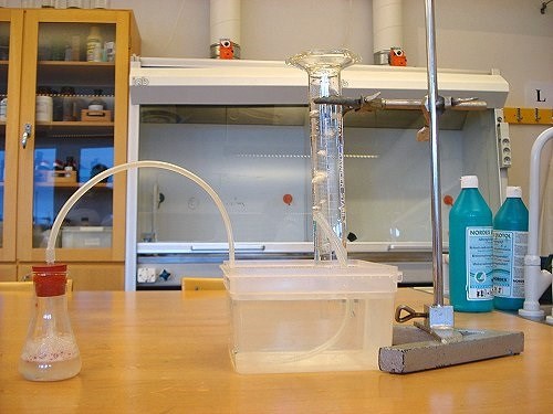 Teraeagle skrev:Det bästa är nog att utföra försöket i en kolv med propp och sidorör. Sedan trär du på en slang på sidoröret och leder in det i ett uppochnedvänt, vattenfyllt mätrör i en bägare med vatten. Gasen som bildas kommer att fylla upp mätröret och trycka ut vattnet så att du enkelt kan läsa av gasvolymen.