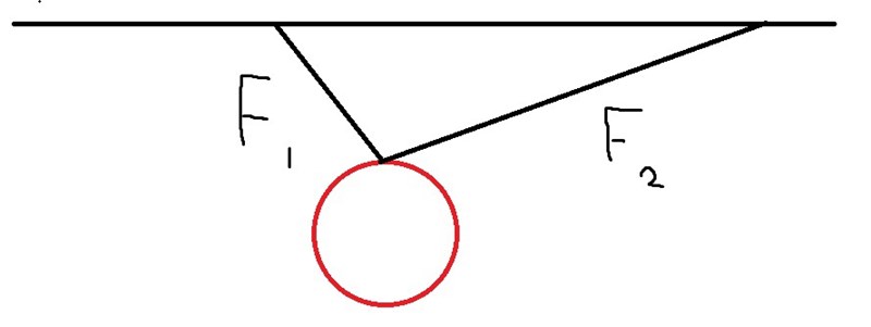 Jag ska alltså sätta ut spännkrafterna f1 och f2. Men jag förstår inte vilken av krafterna f1 och f2 som är störst