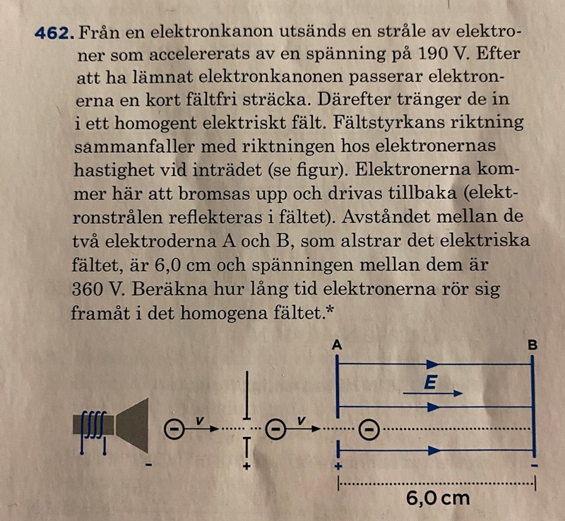 Vi säger att jag sätter positiv riktning åt höger i hela uppgiften. Då kommer såklart hastigheten att vara positiv. Sedan när elektronen är i kraftfältet kommer hastigheten bli negativ då den byter riktning när den accelererar mot den positiva sidan. Detta borde medför att accelerationen även då kommer vara negativ, då jag satt positivt åt höger. Är dock osäker på kraftfältet, men jag chansar att även den kommer bli negativ