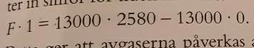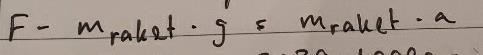 Vänstra ledet har jag delat upp i tryckkraften F mot raketen samt avgasernas tyngdkraft. Tillsammans representerar detta den totala kraften på avgaserna, som ju gav accelerationen 2580. Sedan bryter jag ut F och får bara tryckkraften från avgaserna som är motkraft uppåt.