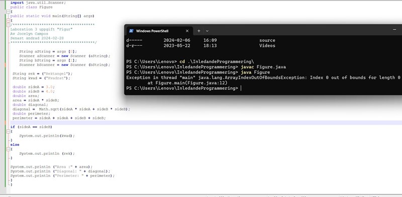 Jag har fastnat i hur jag ska använda metoden scanner. Hittar olika  sätt, ett sätt enligt uppgiften vi fått, ett annat via en bok och sen lite via nätet. Känner mig väldigt osäker på hur jag ska göra. Källkoden jag gjort visar enbart en felkod (i kommandotolken). Men jag lyckas ju inte använda mig av scanner funktionen.