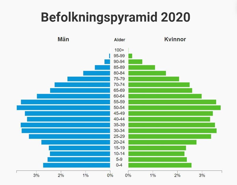 Att det är en stor bubbla på 50 och en stor bubbla på 30, beror på att det är den stora gruppen runt 50 som skaffade barn när de var i 20 års åldern. Eftersom många skaffade barn samtidigt, jämfört med perioden innan, uppstår en sådan bubbla i pyramiden.  Den generationen har just börjat skaffa fler barn, därav bubblan alldeles i botten.