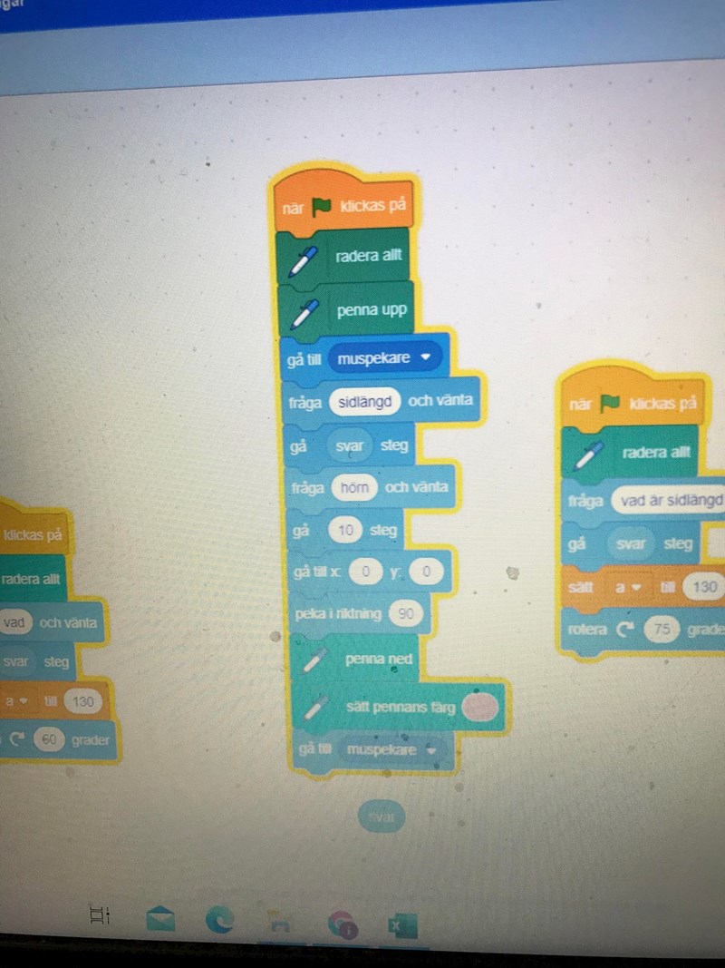 Börja med att tänka igenom hur programmet ska arbeta för att rita polygonen. Pennan ska först gå ett antal steg för att ge en sida med rätt sidlängd, sedan ska pennan vridas en viss vinkel. Därefter ska detta upprepas ett visst antal gånger, så att vi får en komplett figur. Hur ser detta ut programmeringsmässigt? :)