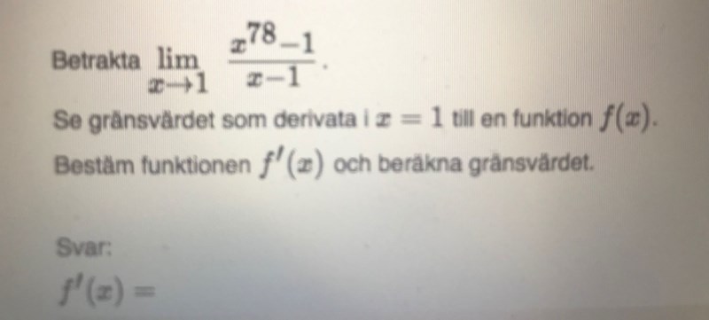 Se gränsvärdet som derivata i x=1 till en funktion f(x). Bestäm f'(x).