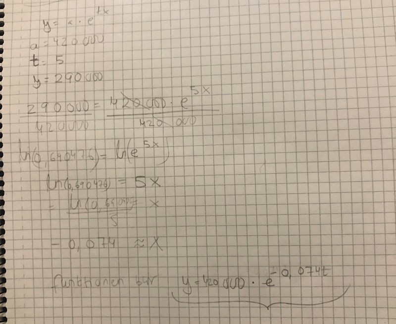 Värdet av en segelbåt minskar exponentiellt med tiden. Segelbåten köptes för 420000kr för fem år sedan och idag är den värd 290000kr. Bestäm en exponentialfunktion med basen e som beskriver segelbåtens värdeminskning.