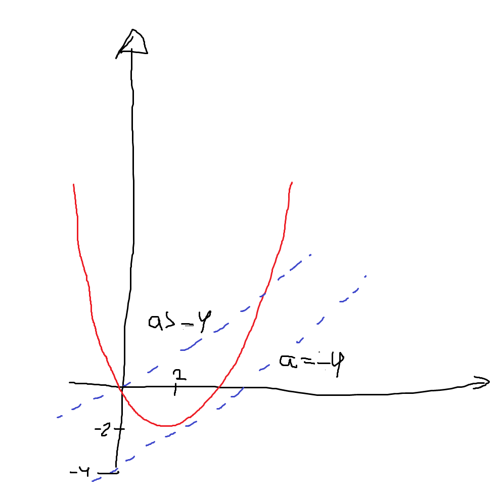 En annan metod är att hitta för vilka a linjen tangerar kurvan. Dessa kommer vara gränserna. Alla a mellan kommer ju resultera i sekanter. Rita upp i Desmos om du inte förstår vad jag menar.