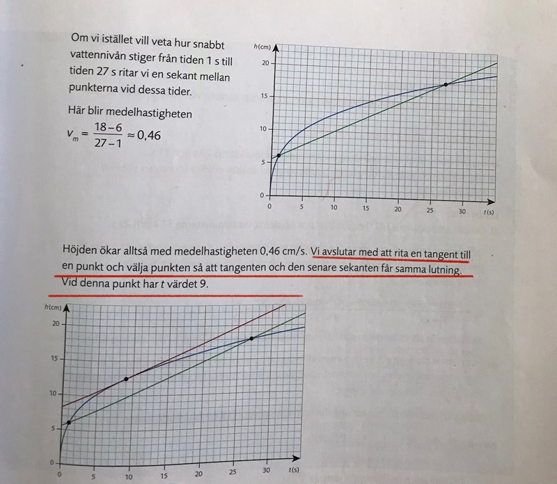 Det jag inte förstår är hur vet man att t=9 ger att tangenten och sekanten har samma lutning (0,46) utan att testa räkna med varenda punkter med k=y1-y2/x1-x2.