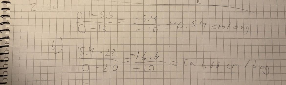 Där är svaret på ”a)” ”ca 0.7 cm/dag”