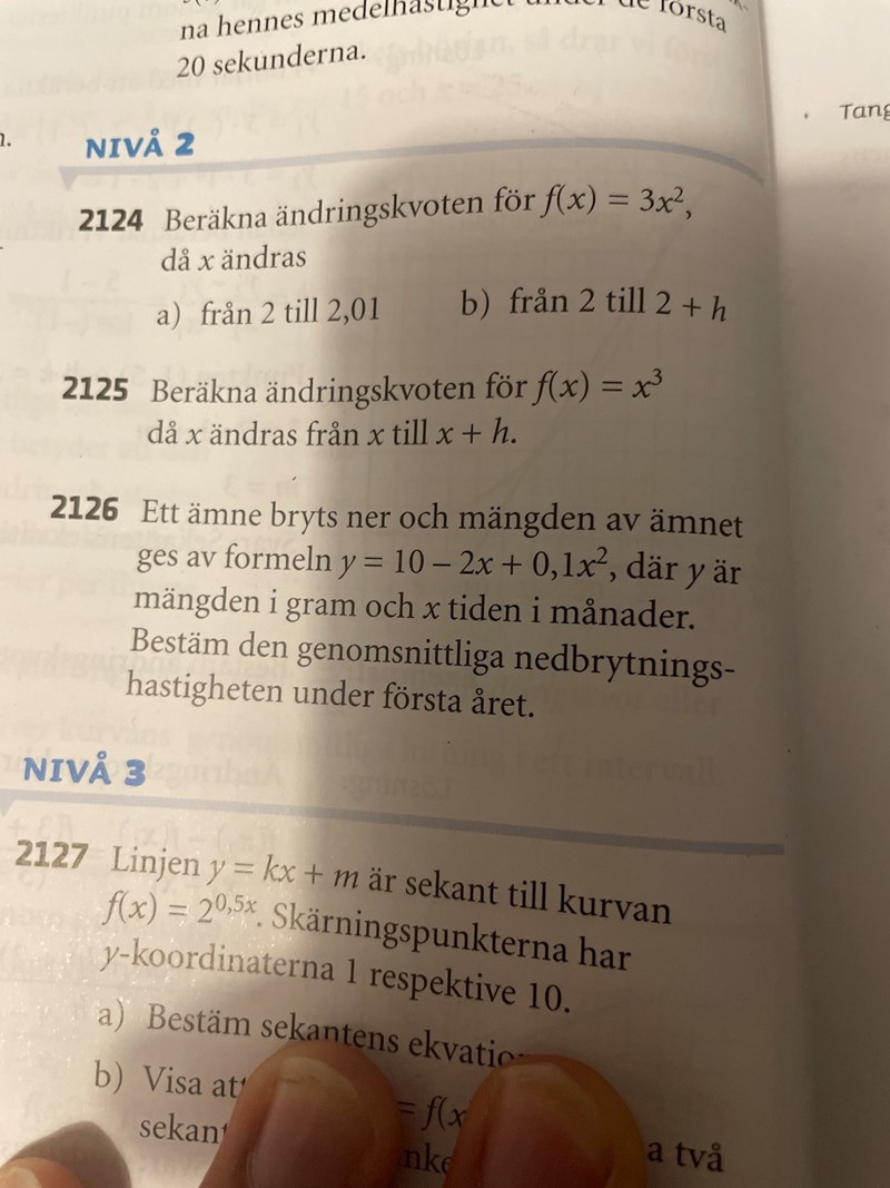 hej, jag har fel svar, facit ger mig positiv 0,8g/månad jag får negativ. Jag har förstått att det är f(12)-f(0)/12-0. Vilket ger mig 04-10/12. Har jag räknat ut det fel, eller är facit fel