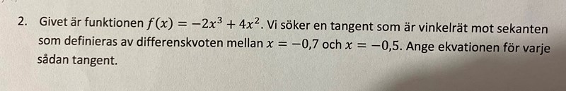Jag beräknade först y-koordinater med hjälp av ekvationen och sen beräknade jag k-värde för sekanten. och jag fick y= -1,16x +0,67 som sekant ekvation. Vi vet att om två räta linje är vinkerräta mot varandra så har de k1 * k2 = -1 => K2 = 0.86. Tangenten ekvation blir Y2 = 0,8x+m.