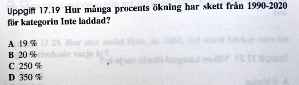 Men iaf. I 1990 var det 8% som svarade inte laddad. i 2020 var det 28%, som är 24 (3*8)+ 4 (8/2). Det är 3,5 gånger mer, så jag svarade 350%. Facit säger C. Varför?