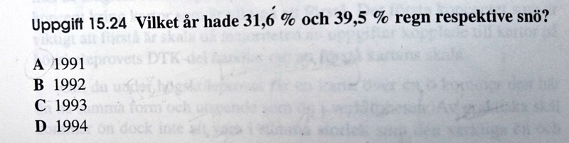 Vi provar 1991 totalt 3+8+15+12 = 38 varav regn och snö = 15+12= 27 vilket motsvarar 27/38= 71%