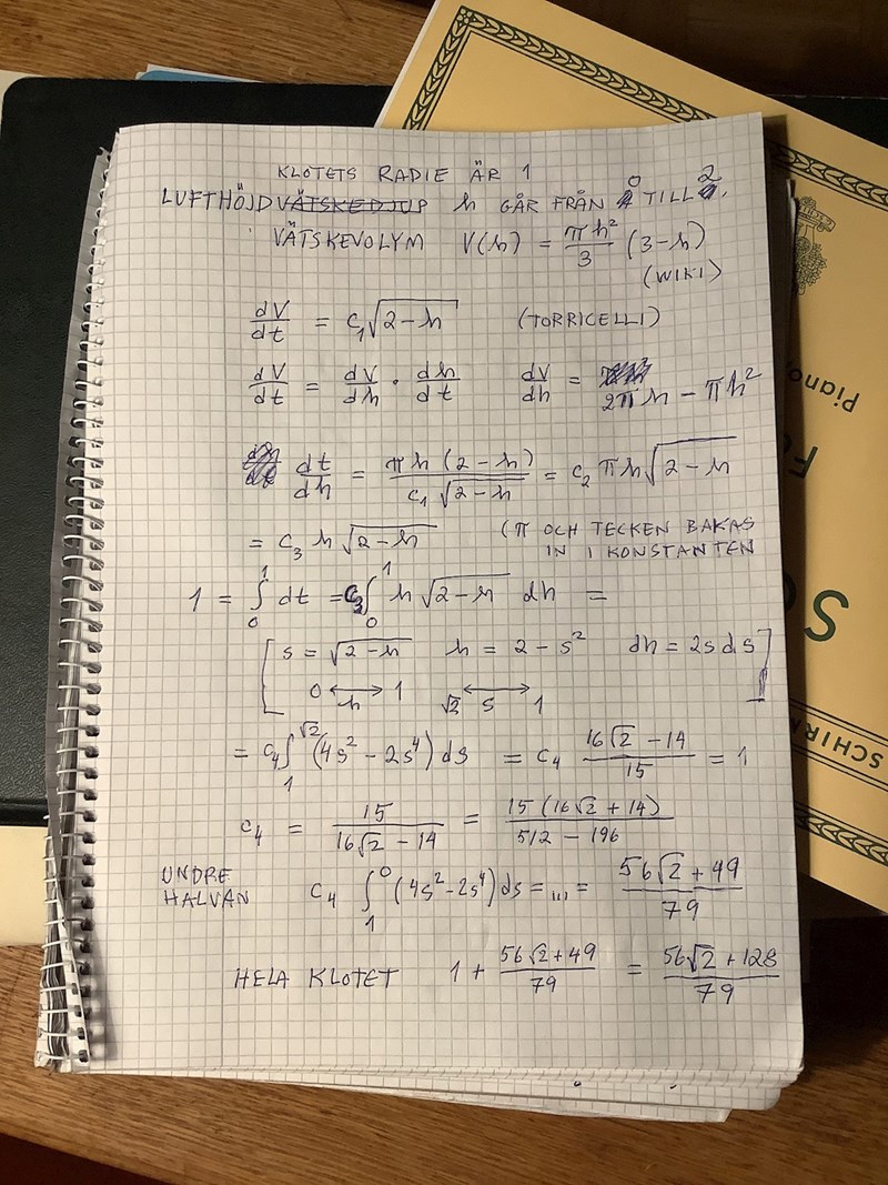 Mogens skrev:Problemet här tycker jag är “det stympade klotet”. Om vi tar en melon med känd radie och gör ett plant snitt med samurajsvärd så kan vi bestämma de två delarnas respektive volymer, men jag drar mig för det – verkar jobbigt. Men i så fall kunde man kanske få fram en diffekv.